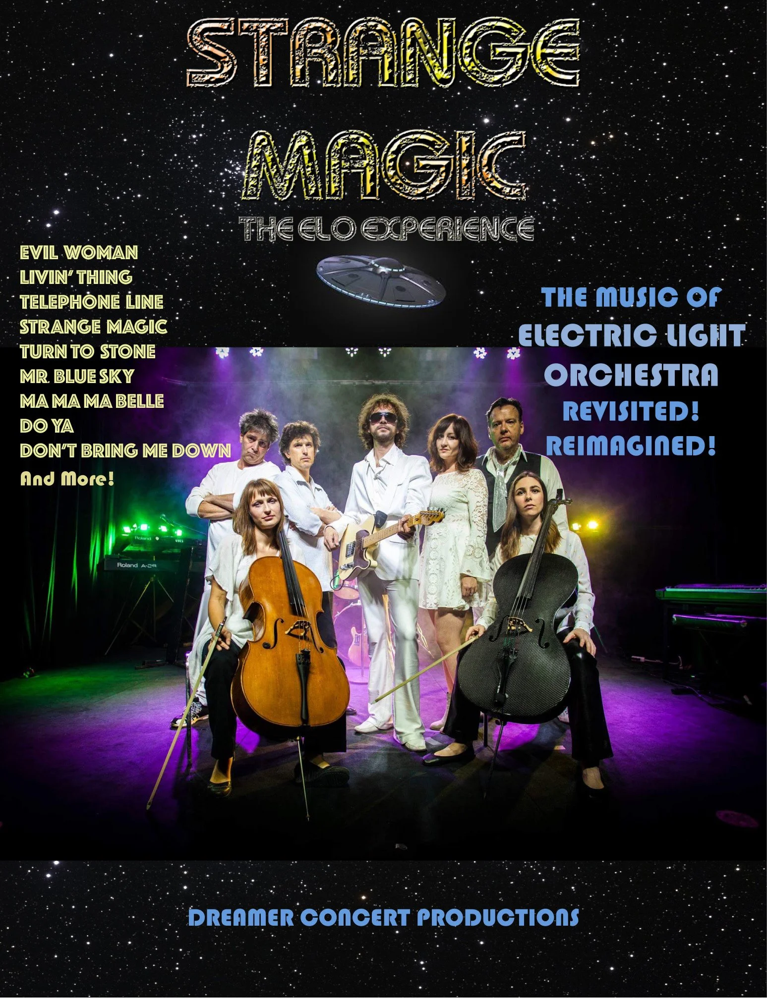 STRANGE MAGIC is the authentic re-creation of legendary '70s rock band ELO (Electric Light Orchestra), a multi-media show featuring not only music but background imagery and film. A 8-piece group of multi-instrumentalists perform all of the sounds used in a real ELO show, with vintage keyboards, live cellos, and intricate vocal arrangements. STRANGE MAGIC unleashes a span of ELO hits, including Living Thing, Evil Woman, Strange Magic, Don't Bring Me Down, Ma Ma Belle, Shine A Little Love and all the rest! Get ready to time-travel back to the classic rock era of the '70s! It doesn't get any closer than this!